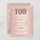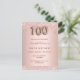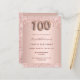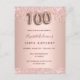 Um convite moderno, na moda e glamouroso para uma 100ª festa de aniversário. Um fundo rosa dourado com gotas. O nome é escrito com um moderno e escuro, rosa dourado, escrito com letra de estilo manuscrito. Personalize e adicione os detalhes da sua festa. O número 100 é escrito com uma fonte de estilo de balão, script.