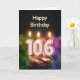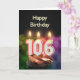 Um bolo de aniversário com velas. As velas são compostas do número 106 para um centenário. Um cartão de aniversário adequado para todos.