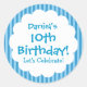 10º Aniversário Sticker Blue Stripes V1C Este adesivo listrado bonito adiciona um toque adorável aos seus convites de aniversário e favores de festa de aniversário. Que fofo! Personalize com o nome da aniversariante ou do menino!