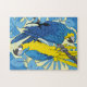 Duas arararas azuis e douradas em meio à luxuosa cobertura da selva sul-americana. Este é um quebra-cabeça excelente para pessoas vivendo com a cor verde-vermelha.