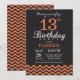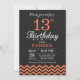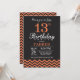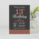 Convite de aniversário de 13 com Chevron Negro e Coral. Chalkboard. Aniversário de crianças. Convidar Menino ou Menina. Para mais personalização, clique no botão "Personalizar" e use nossa ferramenta de design para modificar este modelo.