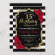 15 Aniversário Convite Elegante design vermelho branco preto com brilho falso. Listras pretas e brancas com rosas vermelhas. Perfeito para uma bolsa mensageifesta de aniversario elegante.