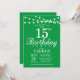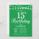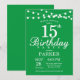 15 Aniversário com Luzes de Cordas. Fundo Verde. Aniversário de criança. Menina ou Menina Senhora Elegante Convide. 13 15 16º 18º 20 21rua 30 40º 50º 60º 80 de 70 100º, qualquer idade. Para mais personalização, clique no botão "Personalizar" e use nossa ferramenta de design para modificar este modelo.