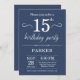 Convite de Aniversário de 15 com Fundo Azul.Aniversário de crianças. Convidam o Menino ou Menina Bday. 13 15 16º 18º 20 21 rua 30 40º 50º 80 de 60º 70 de 100º, qualquer idade. Para mais personalização, clique no botão "Personalizar" e use a ferramenta design para modificar este modelo.