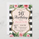 16º Convite de Aniversário para a adolescência, senhora. Doce Dezesseis. Convidar Festa de aniversário Preta e Dourada. Dourada Glitter. Flor Floral Cor de Água Rosa. Black and White Stripes. Digital Imprimível.
