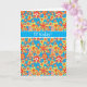 Um 17o cartão de aniversário com all over um teste padrão de flores vermelhas, alaranjadas, amarelas em um fundo brilhante de turquesa, de uma colagem de papel pintado à mão por Judy Adamson.