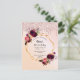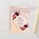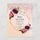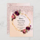 Na frente: Um convite para uma 18ª festa de aniversário. Um fundo ombre rosa dourado com uma estrutura geométrica falsa dourada. Decorados com flores roxas escuras e burgueiras, rosas e penas do estilo "boho". Derrame de ouro rosa a azul pingando. Modelos para um nome e detalhes da festa. O nome é escrito com um script de estilo manuscrito, letras coloridas de cinza. Traseira: fundo colorido a Rosa dourado e gota a direito.