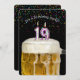 Vela número 19 na caneca de cerveja com confete colorido em preto para o convite da festa de aniversário 19.
