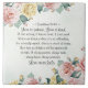 O azulejo de cerâmica inspiracional mostra lindas rosas rosa e amarelas e apresenta Bíblia Verso 1 Corintianos 13:4-8, " O amor é paciente, o amor é gentil. Não inveja, não se vangloria, não se orgulha. Não desonra os outros, não é autoprocura, não é facilmente aborrecida, não mantém qualquer registro de erros. O amor não se encanta na mau, mas se regozija com a verdade. Ela sempre protege, sempre confia, sempre espera, sempre persevera. O amor nunca falha."