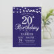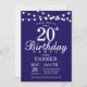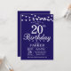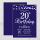20 Birthday Invitation com luzes de cordas. Fundo Azul Marinho. 13 15 16º 18º 20 21 rua 30 40º 50º 80 de 60º 70 de 100º, qualquer idade.