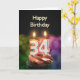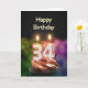 Um bolo de aniversário com velas. As velas são compostas pelo número 34, para um aniversário de 34 anos. Um cartão de aniversário adequado para todos.