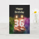 Um bolo de aniversário com velas. As velas são compostas pelo número 36, para um aniversário de 36 anos. Um cartão de aniversário adequado para todos.