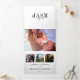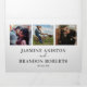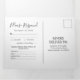 Elegante, tudo em um convite minimalista de casamento triplo, com um fundo branco, fotos da noiva e do noivo, seus detalhes de casamento, um convite de casamento, e um cartão postal de entrada de comida rsvp para seus convidados cortarem e enviarem de volta.