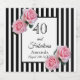 Uma etiqueta para uma festa de aniversário de 40 anos. Listras verticais negras e brancas clássicas como fundo. Com rosas rosadas femininas e femininas como decoração. Um quadro à frente com o texto: 40 e Fabuloso e modelos para nome e data.