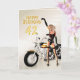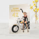 Uma garota com uma moto apontando para a mensagem de aniversário feliz. Um cartão de excelente para o homem que ama suas bicicletas!