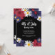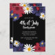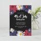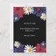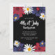 Convite de festa do estilo retrô no 4º de julho. Flores vermelhas, brancas e azuis sobre fundo preto. Personalize a frente e trás com os detalhes do seu partido!