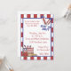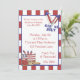 Convite patriótico com fronteira vermelha, branca e azul, bandeira americana, comida e fogos de artifício.