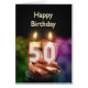 Um bolo de aniversário com velas. As velas são compostas pelo número 50, por 50 anos. Um cartão de aniversário adequado para todos.