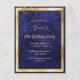 Na frente: Uma moderna e moderna carta de convite de aniversário 50º para homens. Um fundo azul escuro, azul marinho. A cor azul é irregular. Com um falso quadro de ouro e um confete de ouro, letras coloridas de ouro. Modelos para informações sobre a sua parte. Fundo branco.