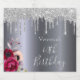 Uma etiqueta para uma 60ª festa de aniversário. Um fundo metálico de aspecto prateado escuro. Decorado com púrpura escura e flores cor-de-rosa-burro e rosa, brilho fino prateado, aparência de pingar tinta. Modelos para um nome. O texto: 60º Aniversário é escrito com um grande estilo escrito à mão.