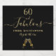 Uma simples e elegante etiqueta de 60º aniversário. Um fundo preto clássico com dois copos, flautas como decoração. Com o texto: 60 e fabuloso. Personalize e adicione um nome e uma data. Data de nascimento ou data da festa. Ouros. A palavra Fabuloso é escrita com um moderno estilo escrito à mão com traços.