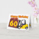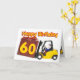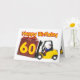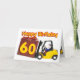 Uma empilhadeira guardara um pacote com a idade nela em letras amarelas brilhantes. Um cartão de aniversário animador e engraçado para um homem.