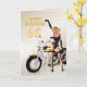 Uma menina com uma motocicleta que aponta na mensagem do feliz aniversario. Um grande cartão para o homem que ama suas bicicletas!
