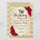 Convite de aniversário de 70. Design elegante em ouro e vermelho. Apresenta faixas de ouro com brilho sutil, fonte de script do rosa vermelha na moda e confetti. Perfeito para uma festa de aniversário de vidro.