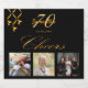 Rótulo do frasco para uma festa de aniversário de 70 glamourosa. Personalize e adicione 3 das suas próprias fotos, um nome, 70 anos e uma data. Data de nascimento ou data da festa. Letras coloridas com ouro. A palavra: Saúde, em ouro falso, escrito com um roteiro de estilo tendencioso. Cor de fundo preto elegante, clássico, chic, decorada com fardos de falso ouro.