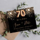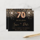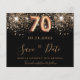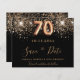 Uma moda e moda Salve a data para uma festa de aniversário 70. Um fundo preto decorado com falso brilho dourado. Modelos de uma data, nome e texto. Letras coloridas com ouro. O texto: Salvar a Data é gravado com um script de estilo com letra de tendência grande.
