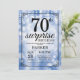 Convite de Aniversário para 70 de Surpresa com luzes azuis de cordas com fundo azul de brilho. Aniversário Azul. Aniversário Adulto. Homens ou Mulheres no Dia Convidam. 13 15 16º 18º 20 21 rua 30 40º 50º 80 de 60º 70 de 100º, qualquer idade. Para mais personalização, clique no botão "Personalizar" e use a ferramenta design para modificar este modelo.