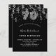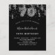 Um convite moderno, na moda e glamouroso para uma festa de aniversário 70. Um fundo preto, decorado com um confete prateado. O nome é escrito com um moderno estilo escrito à mão. Personalize e adicione os detalhes da sua festa. O número 70 é escrito com uma fonte do estilo do balão, padrão leopardo.