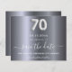 Um cartão Guardar Data elegante para uma festa de aniversário 70. Um fundo metálico moderno falho prateado. Personalize e adicione uma data e nome/idade. O texto: Salvar a Data é gravado com um script de estilo com letra de tendência grande. Número 70 com uma fonte no estilo do balão.