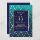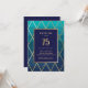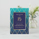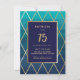 Este 75th convite elegante e na moda da celebração do aniversário pode ser personalizado para sua ocasião especial. Caracteriza um quadro do ouro (folha simulada) e linhas geométricas do ouro no fundo assim como uma aguarela azul do ombre denomina Washington. Dentro do ouro o quadro é uma caixa do fundo dos azuis marinhos. "75" estão em uma pia batismal à moda do roteiro. Um perfeito convida para um aniversário do marco miliário.