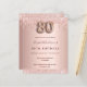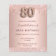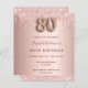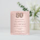 Um convite moderno, na moda e glamouroso para uma festa de aniversário 80. Um fundo rosa dourado com gotas. O nome é escrito com um moderno e escuro, rosa dourado, escrito com letra de estilo manuscrito. Personalize e adicione os detalhes da sua festa. O número 80 é escrito com uma fonte de estilo balão, script.