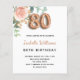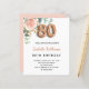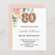 Um convite elegante para uma festa de aniversário 80. Um fundo branco chic. Decorados com um rosa de ouro e rosa cor-de-rosa-esbranquiçada, folhas de eucalipto florais, verdes, galhos, verde e borras de ouro. Personalize e o nome e os detalhes da festa. Letras pretas e ouros. O nome é escrito com um moderno estilo escrito à mão. O número 80 é escrito com uma fonte no estilo do balão de ouro. Traseira: cor de fundo rosa dourada.