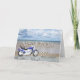 Um ciclo de motor azul que está em uma praia com as nuvens macias no céu. O feliz aniversario escrito na rocha refletiu na água que encontra-se na areia.