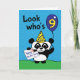 Nossa amiga panda está desejando a um menino especial um feliz aniversário de 9 anos! Em uma mão, ele está segurando um cartão de aniversário feito à mão que diz "Parabéns" com um belo coração vermelho. Por outro lado, ele segura um balão azul brilhante (com um grande número amarelo 9). O fundo do cartão é giro em azul claro. Ilustração original de Bethany J. Mitchell do Darcy Place Studio.