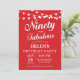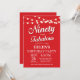 90 Birthday Invitation with String Lights Red Background. Festa de aniversário de mulher. Noventa e fabuloso. Qualquer idade.