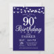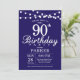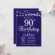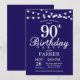 90 Birthday Invitation com luzes de cordas. Fundo Azul Marinho. 13 15 16º 18º 20 21 rua 30 40º 50º 80 de 60º 70 de 100º, qualquer idade. Para mais personalização, clique no botão "Personalizar" e use a ferramenta design para modificar este modelo.