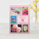 Cartão de 90. Mande lindas flores para uma pessoa bonita. Um cartão de aniversário com um belo sentimento. Uma coleção de imagens enquadradas de flores em um fundo rosa.