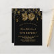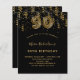 Um convite moderno, na moda e glamouroso para uma festa de aniversário 90. Um fundo preto, decorado com confete. O nome é escrito com um moderno estilo escrito à mão. Personalize e adicione os detalhes da sua festa. O número 90 é escrito com uma fonte do estilo do balão, padrão leopardo.
