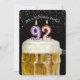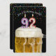 Vela número 92 na caneca de cerveja com confete colorido em preto para o convite da 92ª festa de aniversário.