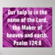 Este artigo é feito sobre um fundo roxo e resplandecente com verso bíblia Nossa ajuda é no Senhor, o Criador do Céu e da Terra. Salm 124:8"