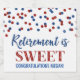 A aposentadoria é um rótulo de garrafa de vinho espumante doce e personalizado com um padrão de brilho azul e vermelho confetti