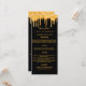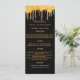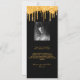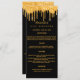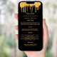 Personalize e adicione seu nome, data, evento e menu. Fundo preto, decorado com pingos de ouro falsos. Voltar: adicionar uma foto, fatos BIO/Divertidos