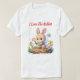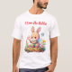 Uma camiseta branca com um design bonito, focada no tema de coelhos e flores. Aqui está a descrição detalhada: impressão central: um adorável coelho de desenho animado sentado no meio de um colorido leito de flores. O coelho tem grandes olhos redondos, bochechas rosadas, e orelhas longas e eretas. O corpo é pequeno, vestindo uma bib verde e tem pequenas asas turquesas leves. O coelho tem um pequeno coração cor-de-rosa numa mão, criando um sentimento doce e romântico. Cenário envolvente: O coelho é colocado em um ambiente natural fresco com vários tipos diferentes de flores, como margaridas, lírios e plantas verdes. Impressão: Acima da imagem do coelho está a linha "Eu Amo o Coelho" escrita em uma fonte macia e vermelha, destacando-se sobre um fundo de camisa branca. Estilo de camisa: Camisa branca, pescoço redondo, mangas curtas. Esta design dá uma sensação doce, adorável e brilhante, perfeita para amantes de os animais ou aqueles que gostam de um estilo fofo e jovem.