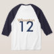 A camisa do estilo manga raglan, de uso masculino, é mostrada em branco com capas azuis marinhos e com um gráfico de futebol esportivo com o ditado "The Canadian Turkey Bowl" e "Football Classic em baixo. Tem Nome e número no verso; Adicione sua própria personalização clicando no botão personalizar. Você pode até mudar o estilo e a cor da camisa, do texto e do texto, se preferir. Também faça esta camisa em mulheres e crianças.
