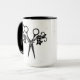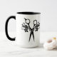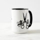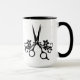 Caneca de café dos cabeleireiro com tesouras e flores no preto em um punho puro do preto do branco 15oz, caneca interna preta com branco puro fora da caneca.