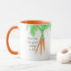 Uma representação aquosa de um pacote de cenouras acompanhada pela frase "raiz para as coisas boas na vida." Esta caneca encantadora é perfeita para entusiastas da jardinagem.